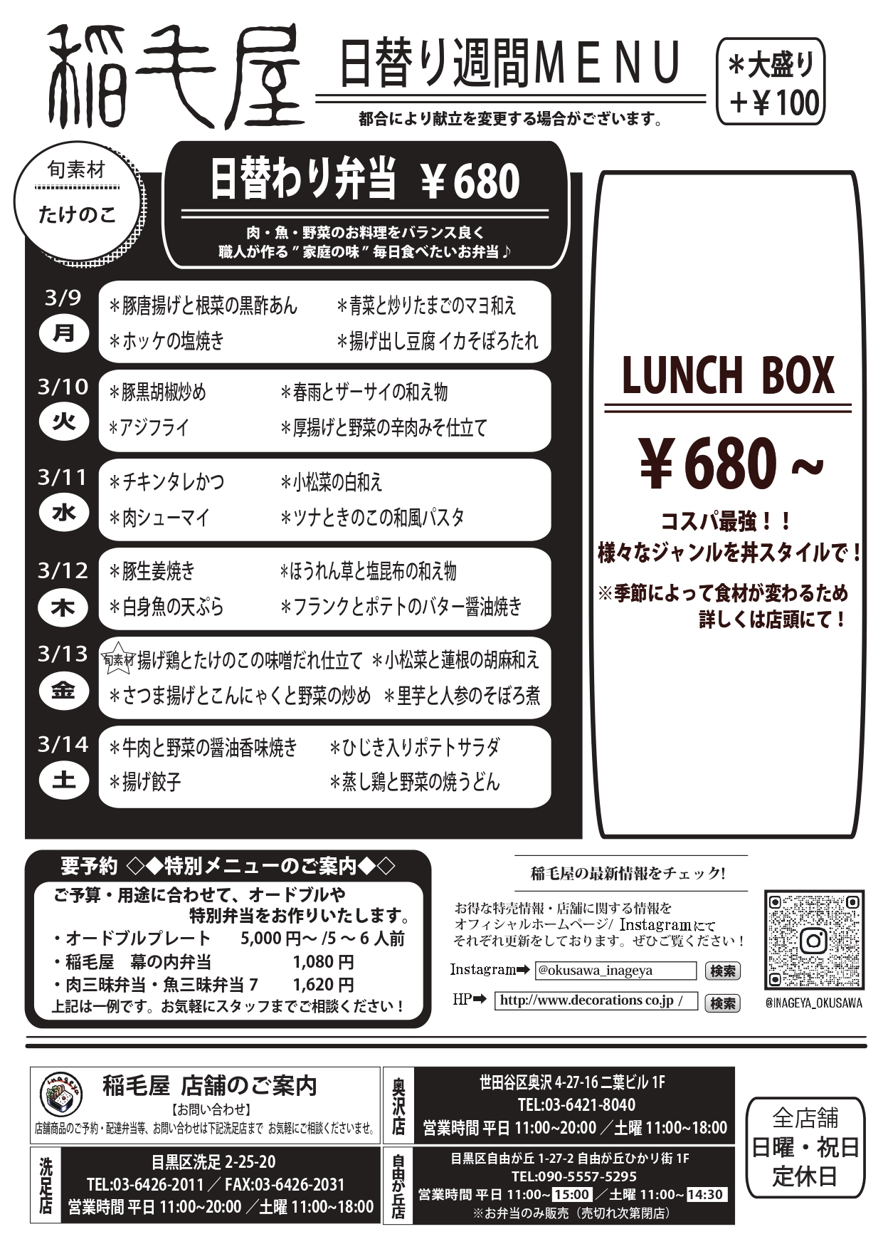 【日替わりメニュー】2026年3月9日(月)~3月14日(土)