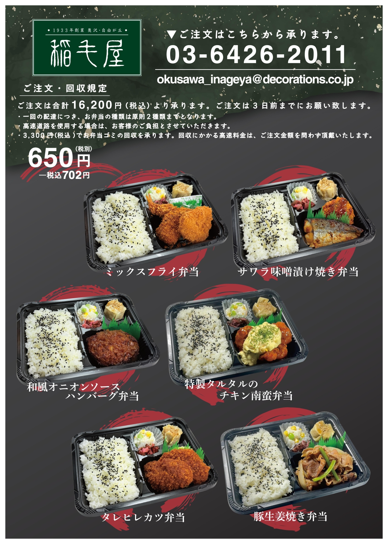 表題の件、2/16(月)~【配達弁当】の一部メニュー改定につきましてご案内させて頂きます。 ホームページリニューアル中にて、更新が反映されず皆様には閲覧の際にご迷惑をお掛けして申し訳ございません。 【配達弁当新メニューラインナップ】を添付しております。 ホームページリニューアルが完了するまでの間、こちらでご覧いただけますと幸いです。 ※配達規定も一部変更しております。下記ご確認ください。 ご予算に応じて、単価やメニューアレンジもご対応致します。 まずはお気軽にご相談くださいませ。 何卒今後ともご贔屓いただけますと幸いです。