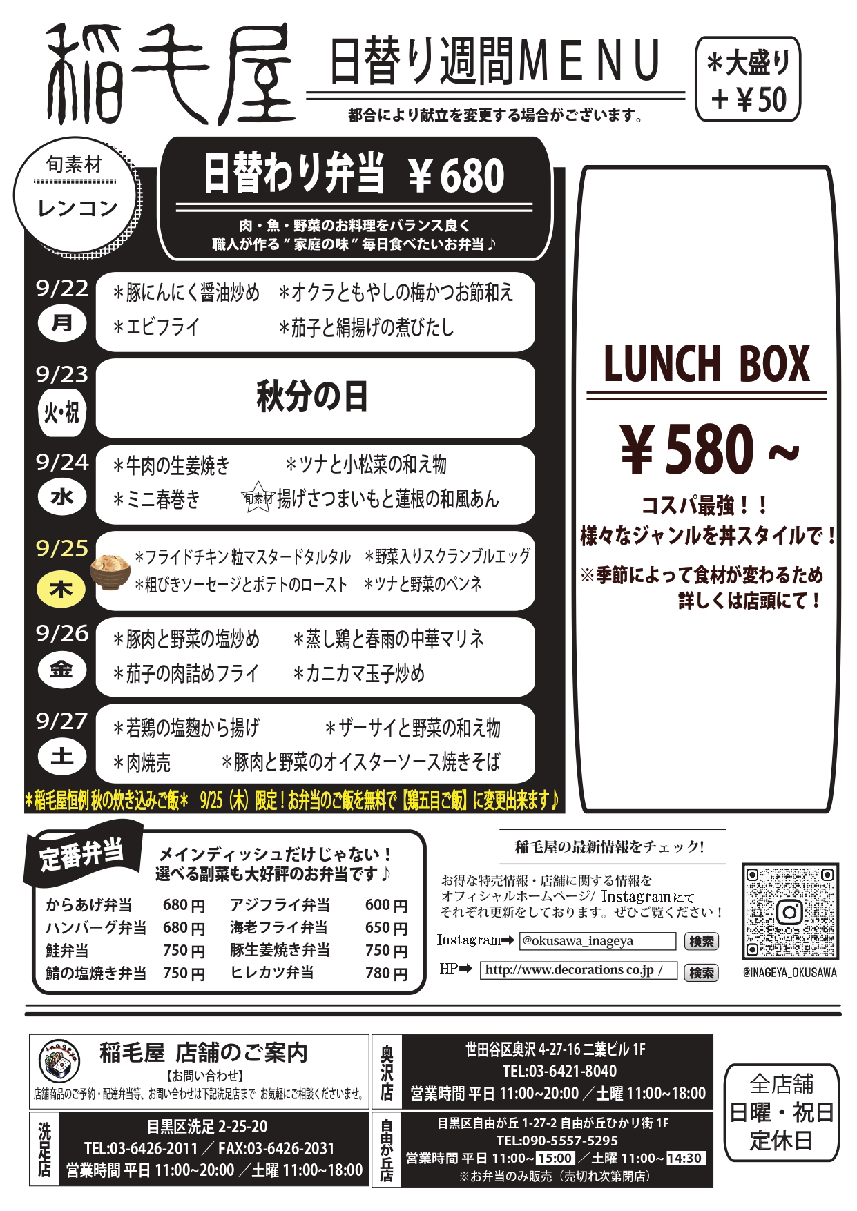 【日替わりメニュー】2025年9月22日(月)~9月27日(土)