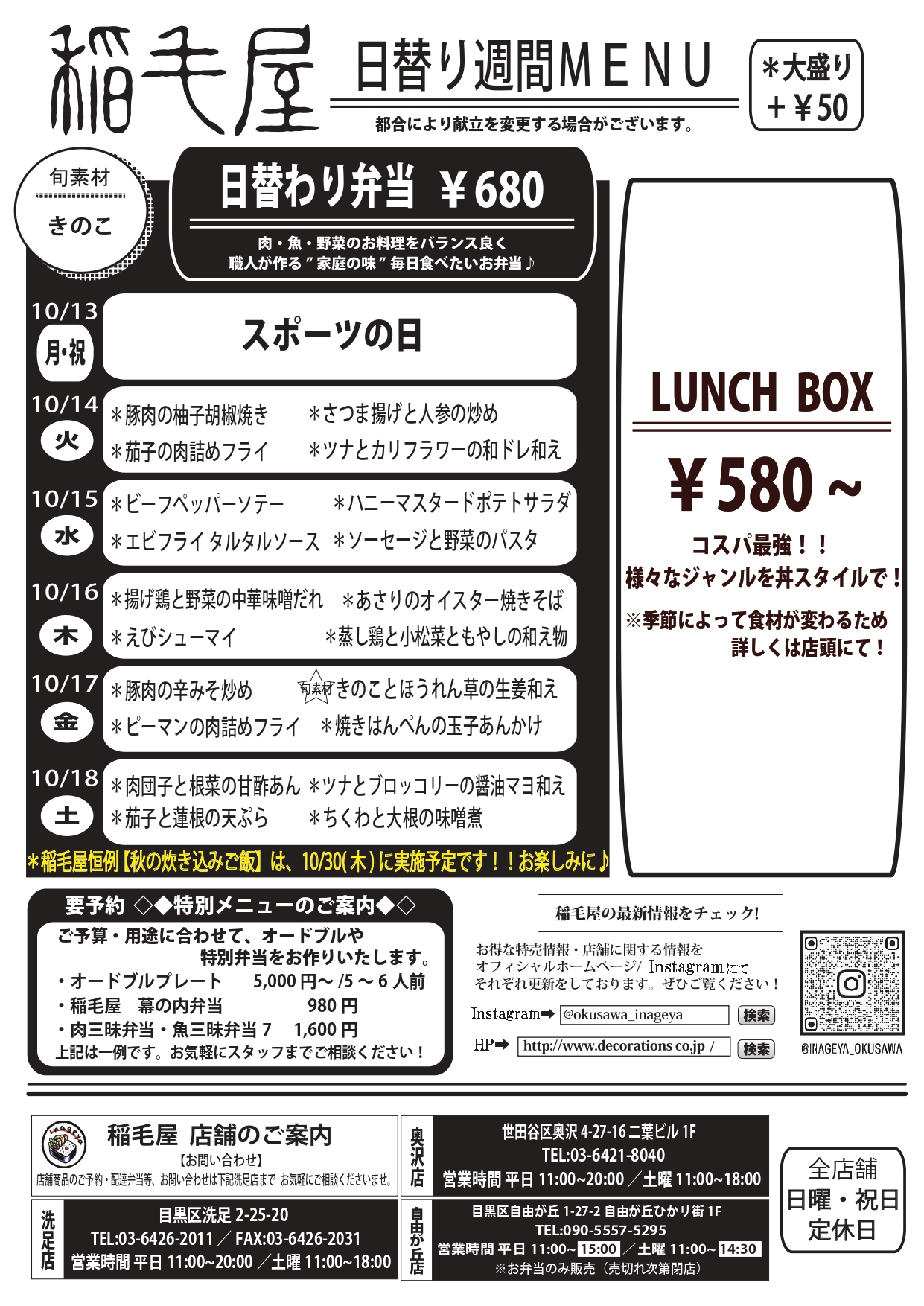 【日替わりメニュー】2025年10月13日(月)~10月18日(土)