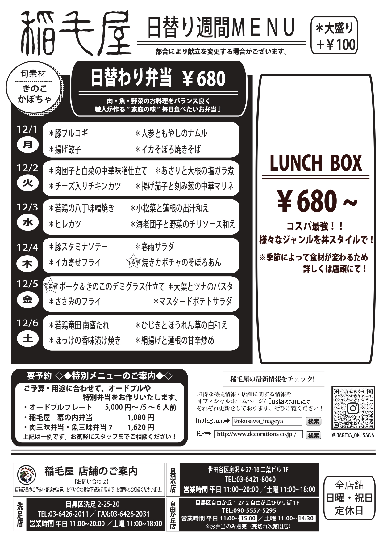 【日替わりメニュー】2025年12月1日(月)~12月6日(土)