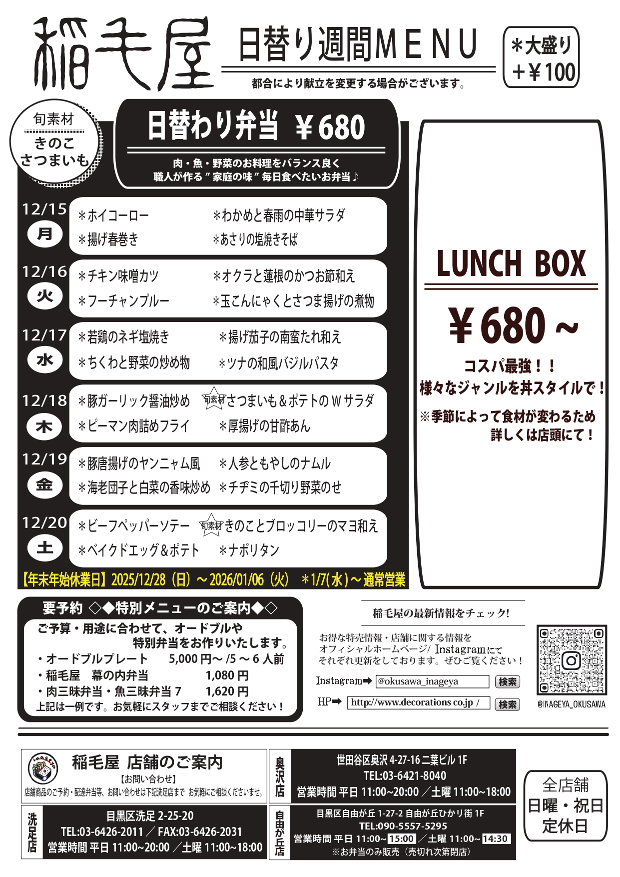 【日替わりメニュー】2025年12月15日(月)~12月20日(土)