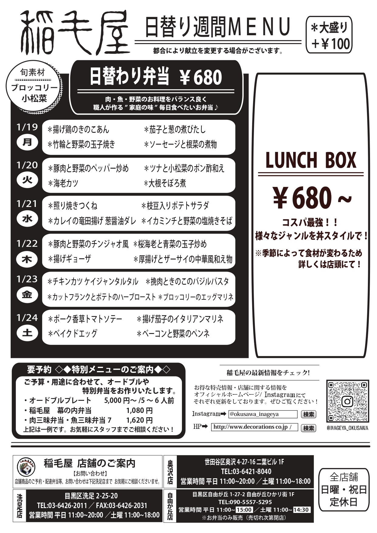 【日替わりメニュー】2026年1月19日(月)~1月24日(土)