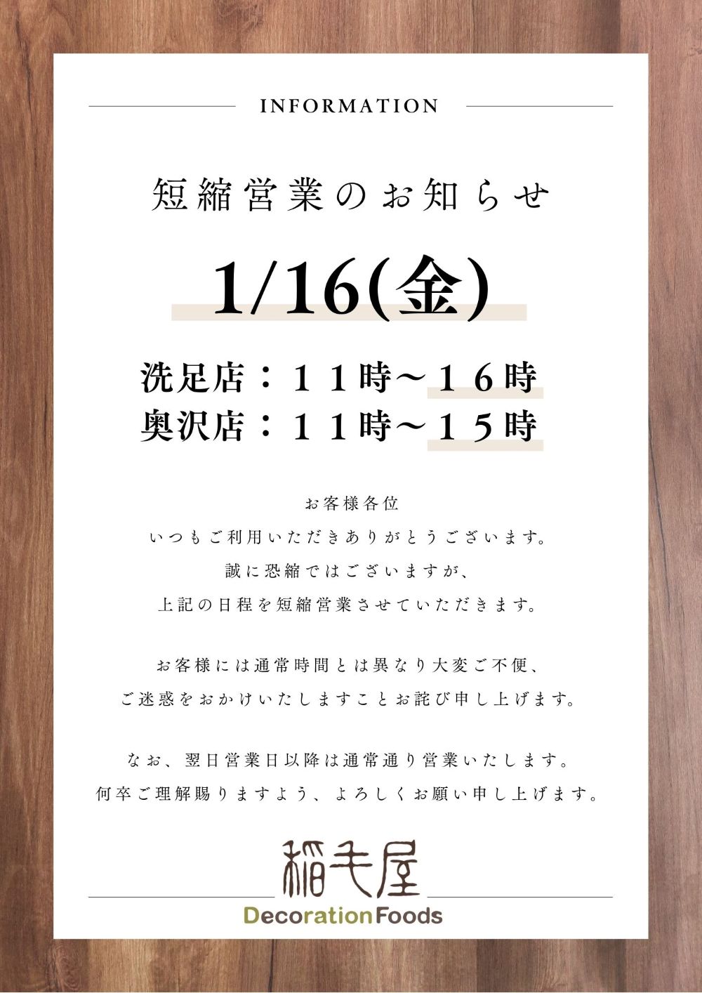 1月16日(金)短縮営業について