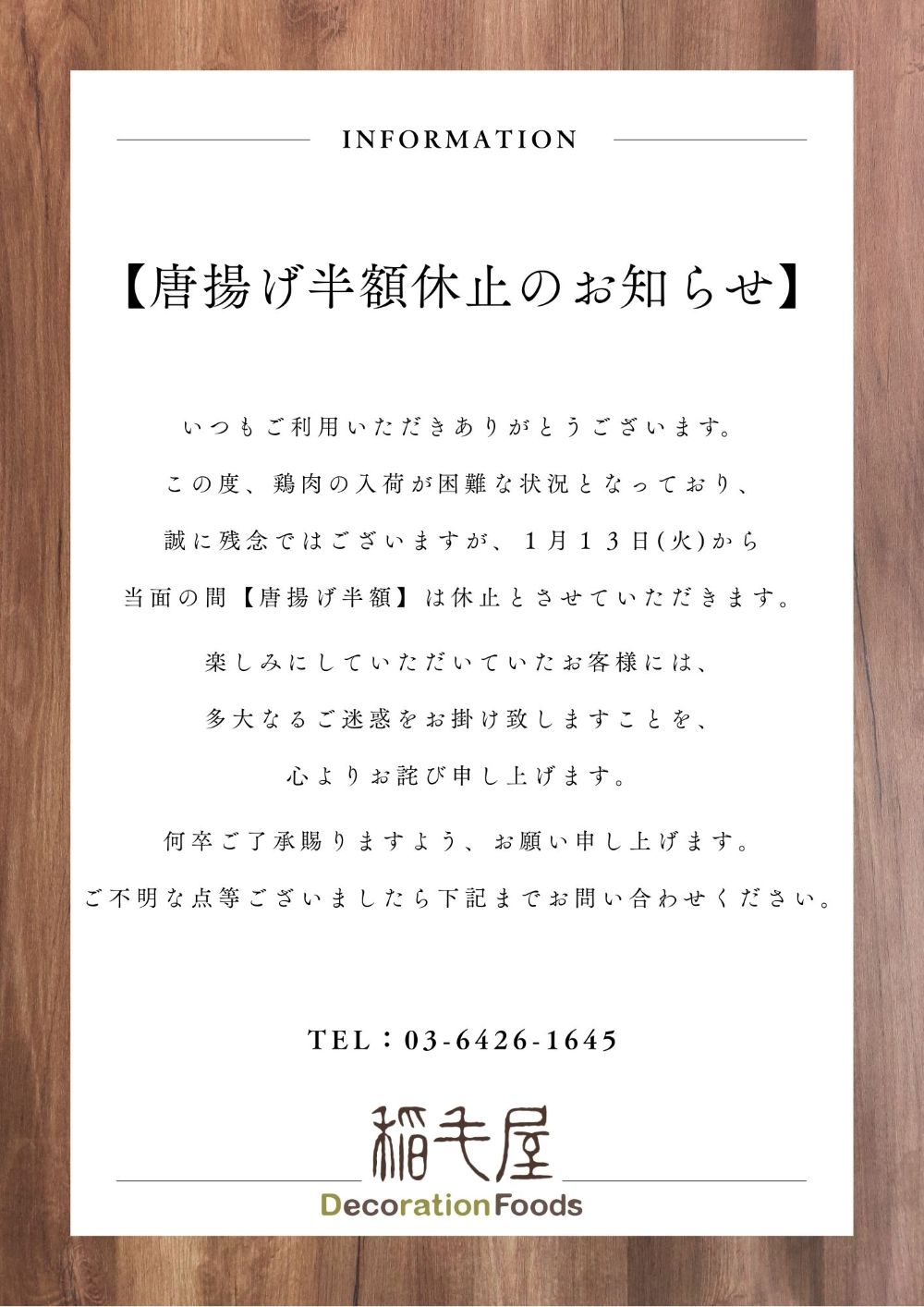 【唐揚げ半額休止のお知らせ】